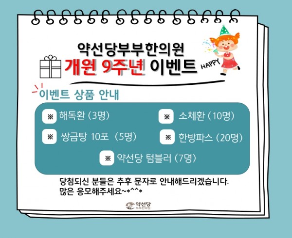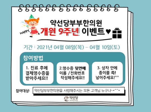 벌써 9주년이 되었습니다!!!!!그동안 주신사랑이 너무 많고 넘치기에더욱더 고객분들께 수준높은 의료서비스를 제공해드리고자 노력하고있습니다.원내에서 작은 경품이벤트를 같이 진행하고 있으니치료 후에 경품응모함에 쏙⚘넣어주세요.❣당첨되신 분들은 추후 문자로 안내해드리겠습니다^^*